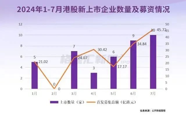 7月港交所共录得10家新股上市 ,合计总募资金额为45.72亿港元。这也是2024年以来单月份录得最高的数字。
