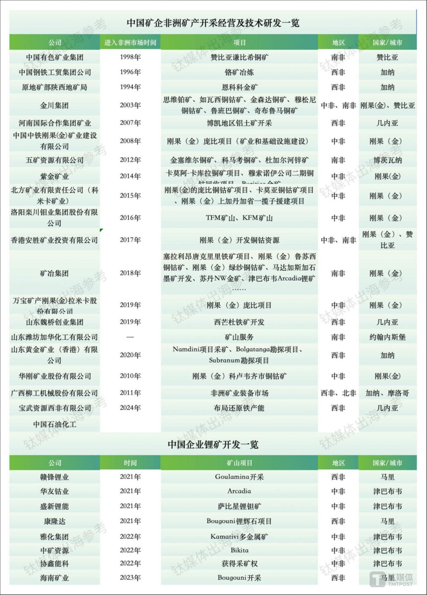 自2021年以来,中企大规模进入到非洲大陆的锂矿项目,赣锋锂业、盛新锂能、天华新能、中矿资源等多家中国企业已有矿产项目在非洲落地,涉及的锂矿包括津巴布韦的Kamativi、刚果(金)的Manono,纳米比亚的Karibib和埃塞俄比亚的Kenticha。