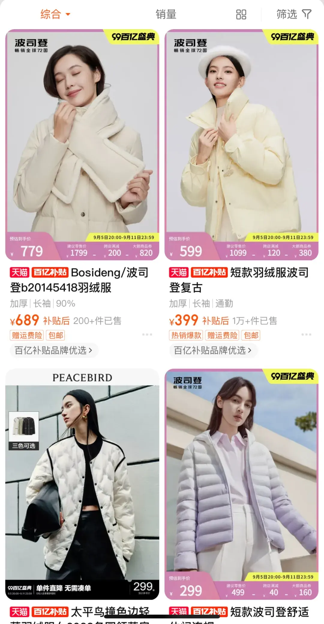 9月5日开卖的淘宝百亿补贴“99百亿盛典”中,鸭鸭的男士羽绒服不到一小时成交额就突破了百万,羽绒服品类整体成交额暴涨400%。波司登、雪中飞、高梵等羽绒服品牌都也加入了这场活动,一件原价1099元的波司登短款羽绒服最低降到了399元。