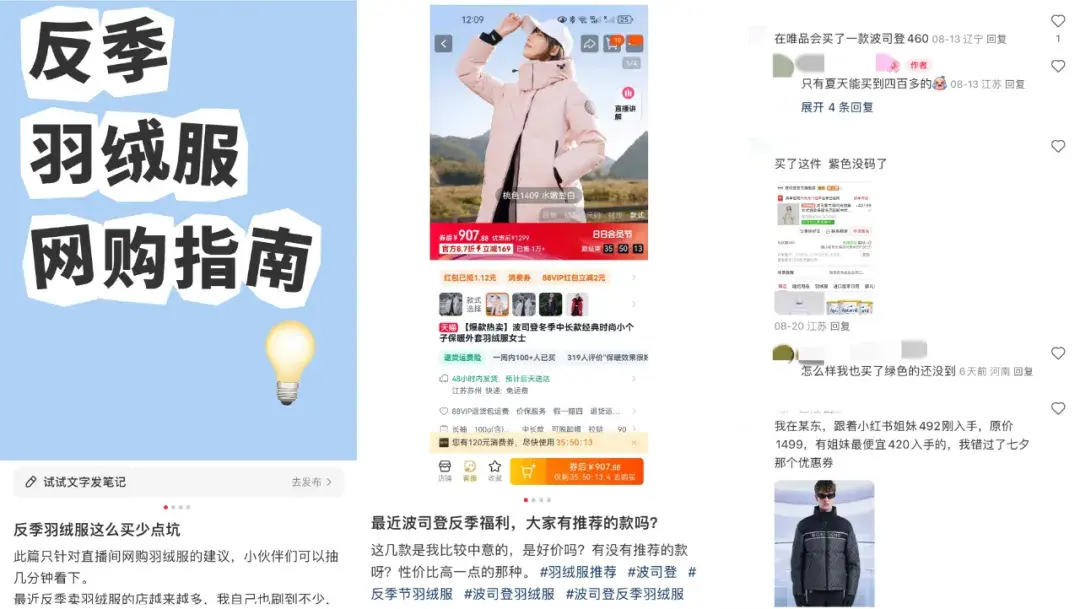 而在小红书上,网友们已经拼凑出了一整个的“反季羽绒服购物大全”。有人直接晒促销优惠做提醒,有人在评论区互相分享自己低价淘到的宝贝,有人提醒大家别忘了看清楚绒子含量、是否是新国标和发货地,还有人建议给家里孩子看看冬天的衣服“至少能便宜好几百”。