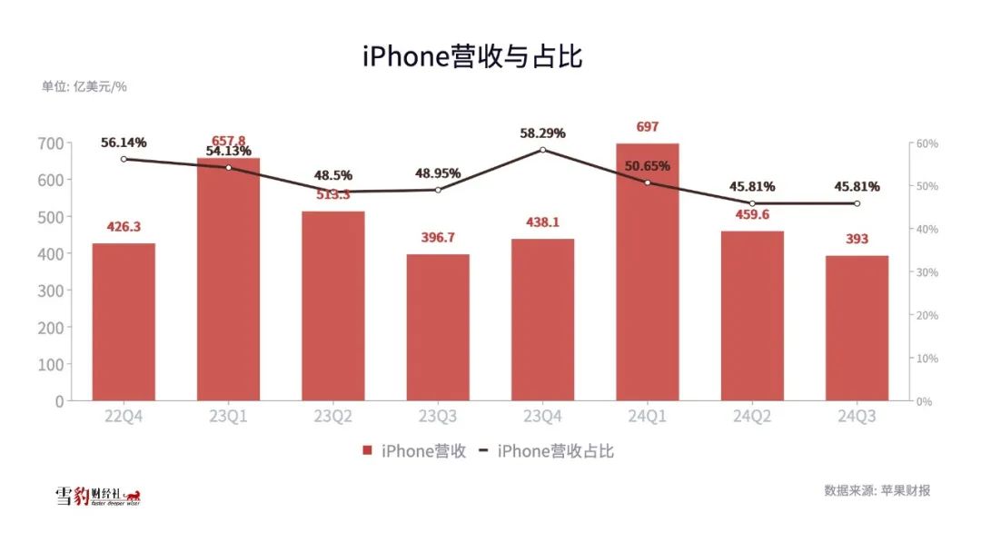 近8个财季,即使在销售淡季,iPhone营收占苹果总营收的比例依然接近一半。服务、AirPods等收入的增长也依赖iPhone的销量。库克在努力降低iPhone的营收贡献占比,但在短期内,这棵摇钱树,对苹果来说没有平替。