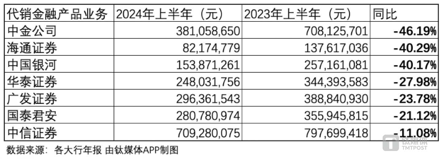钛媒体APP分析了7家头部券商发现,2024年上半年它们的代销收入的均出现了两位数的跌幅,主要原因是权益类公募基金发行和销售承压。