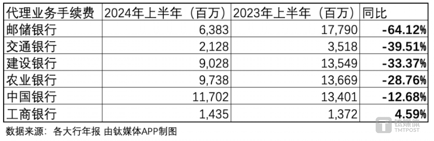 代销业务收入的下降不只出现在券商,在银行业也出现明显下降。六大行对于代理业务手续费收入的下降在中报中做出对应解释: