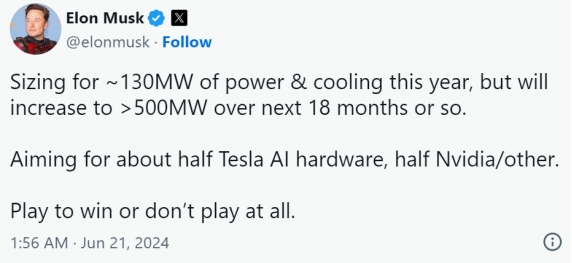 “要么就赢,要么就别玩(Play to win,or don't play at all)。”马斯克6月的一条X信息是对其野心的最好诠释,而他更具体的计划是在今年12月前训练出“按每项指标衡量都是世界上最强大的人工智能。”