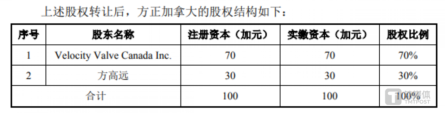 方正加拿大成立于2012年,由方存正出资设立。2016年9月,方存正将方正加拿大70%的股权转让给了Velocity Valve Canada Inc.,同时方存正将方正加拿大30%的股权转让给了方高远,彼时方正加拿大的股权架构如下:
