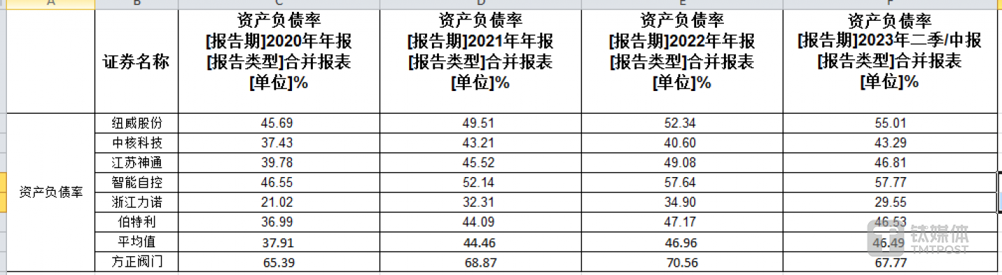 钛媒体APP注意到,方正阀门之所以要募集如此多的资金用于补流或与公司的债务有关。方正阀门在申报稿中披露,其可比公司分别为浙江力诺、中核科技、伯特利、江苏神通、纽威股份、智能自控,但却未披露上述公司的流动比率、速动比率、资产负债率的情况。
