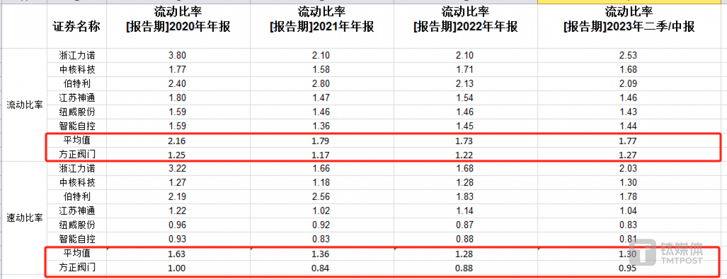 其中,报告期内,方正阀门的流动比率分别为1.25、1.17、1.22、1.27,同行可比公司平均值分别为2.16、1.79、1.73、1.77;速动比率分别为1、0.84、0.88、0.95,同行可比公司平均值分别为1.63、1.36、1.28、1.3;资产负债率分别为65.39%、68.87%、70.56%、67.77%;同行可比公司平均值分别为37.91%、44.46%、46.96%、46.49%。换言之,无论是流动比率还是速动比率,方正阀门均远低于同行均值,特别是资产负债率,方正阀门至少低于同行均值21个百分点。