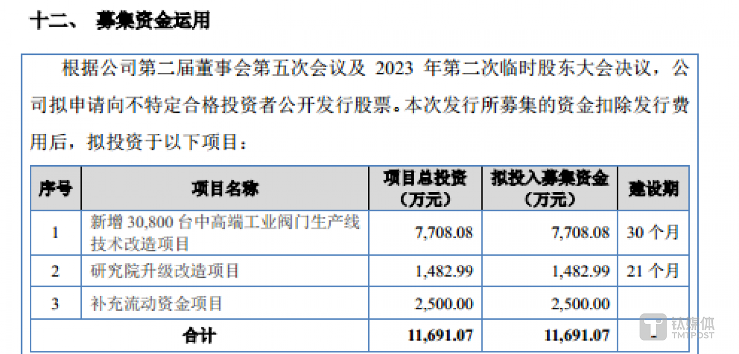 从募投项目上看,方正阀门此次欲募集11691.07万元分别用于新增30800台中高端工业阀门生产线技术改造项目、研究院升级改造项目、补充流动资金项目。