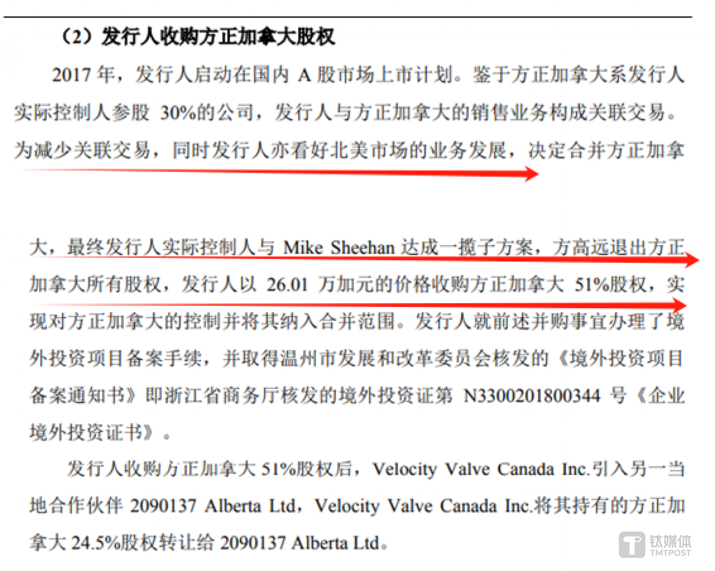 2017年,由于方正阀门启动A股市场上市计划,为了减少关联交易以及看好北美市场的业务发展等因素,方高远退出方正加拿大所有股权,而方正阀门以26.01万加元收购方正加拿大51%的股权。