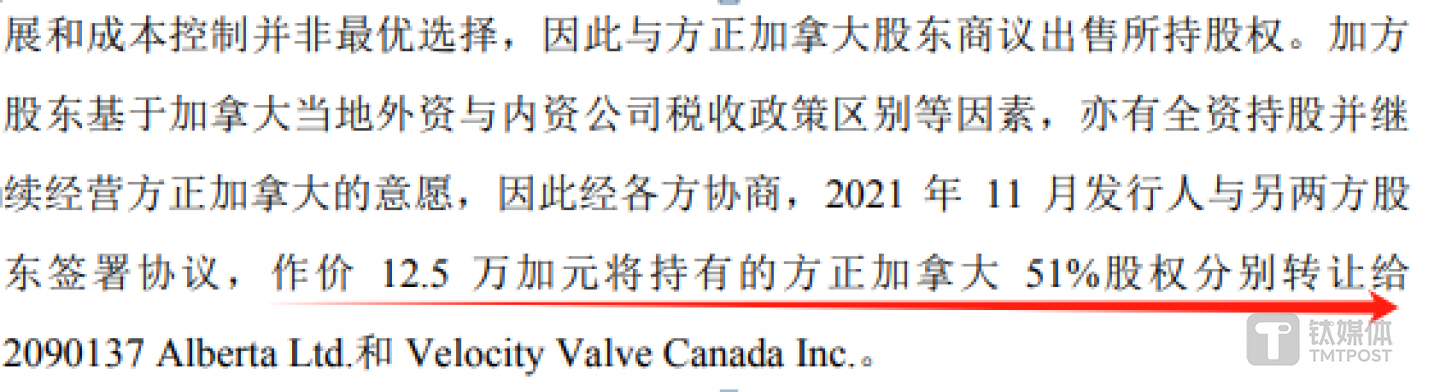 在拿回方正加拿大控制权三至四年后,即2021年11月,方正阀门以12.5万加元的价格将方正加拿大的股权分别转让给了2090137 Alberta Ltd.和 Velocity Valve Canada Inc.。