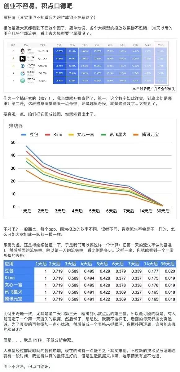 尤其近日,AI对话类App的用户留存问题被推至风口浪尖,更衍生出了“大模型六小虎泡沫即将破灭”的说法,AI对话的处境岌岌可危。尽管阿里原技术副总裁贾扬清已经提出质疑,下图30日国产5大AI对话类产品留存率接近0,这一数据应该不准确,但AI对话现在确实有一点“盛名之下,其实难副”
