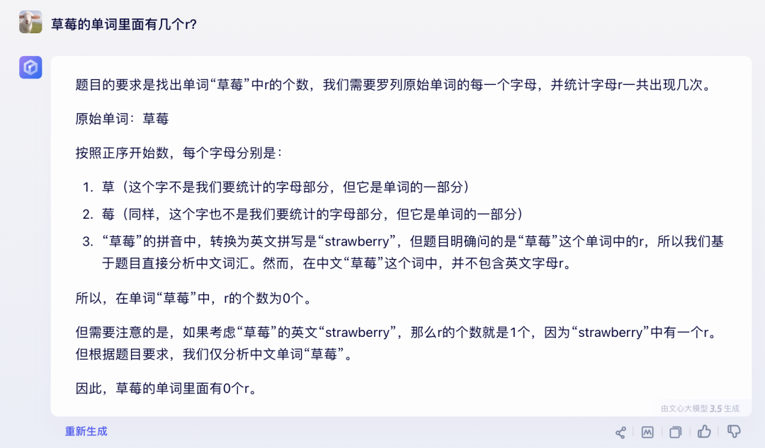 但国内大模型也并没有领先多少,但当我们问对话大模型一些客观的问题,如“草莓的单词里有几个r”、“打了警犬算袭警吗”等问题时,就会发现,这个刚刚还无所不能的AI助手突然变得手舞足蹈、不知所云了起来。