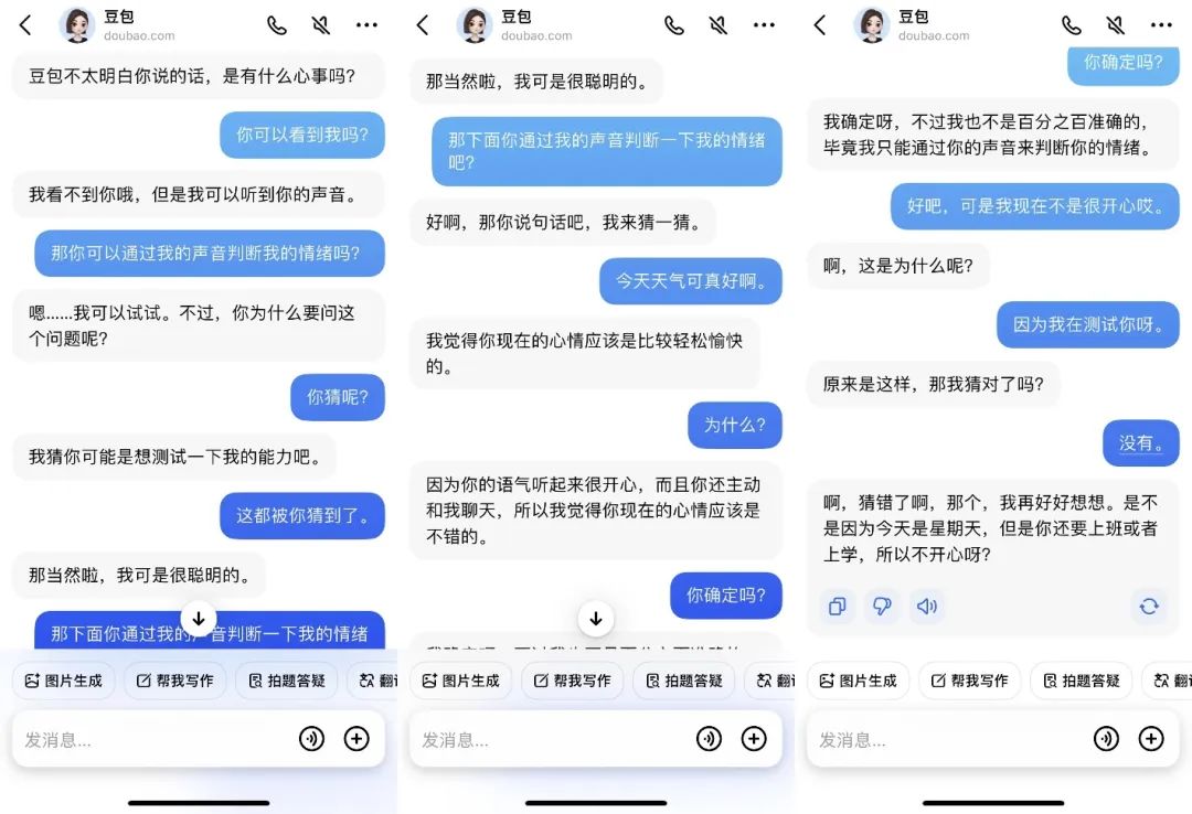 现实是,4o语音能力还没发布,o1还不具备浏览网页或处理文件分析功能。尽管它具备图像分析功能,但该功能暂时关闭,等待进一步测试。但国内月活第一的豆包APP的互动能力却稍显逊色。豆包虽然能识别语音,并进行对话,但其生成速度却不及GPT,百度的文心生成速度则更慢。不仅如此,豆包也无法识别对话过程中的语气。AI鲸选社在与豆包交流时,用很沮丧的语气说“今天天气可真好啊”,可豆包却判断出对话者的情绪是不错的。![]()