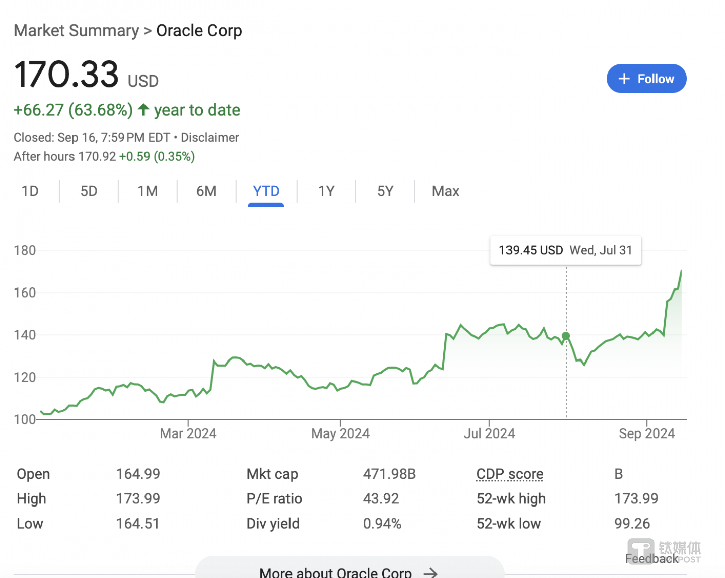 年初至今,甲骨文股价大涨了63.68%,增速高于标普500和纳斯达克综合指数。