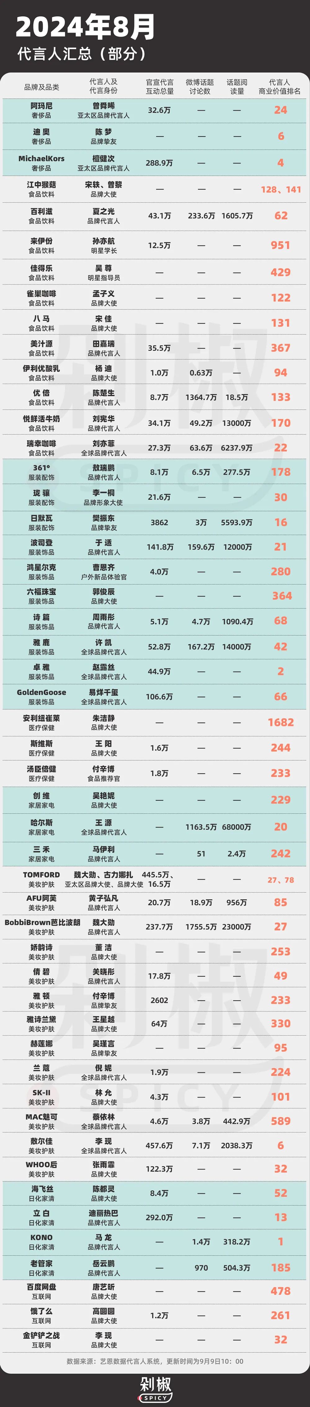剁椒Spicy开辟《代言人月度辣评》栏目,与艺恩等数据平台,以及兰渡、赞意等领先的营销机构联手,盘点代言动向,提炼行业观点。