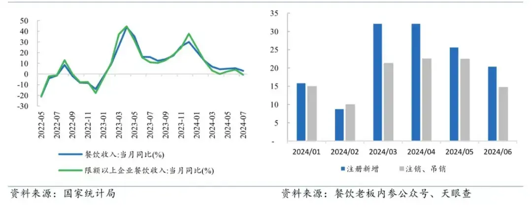 这两年,很多人将开餐厅当做就业稻草,不假思索地涌入本就过剩的餐饮行业,也造成了行业供过于求的现象。天眼查数据显示,截至2024年6月30日,国内餐饮相关企业新注册量达到134.6万家,而注销吊销量也达到105.6 万家(2023全年为135.9家)。