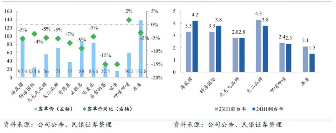 左图:主要餐饮24H1客单价普遍承压 右图:主要餐饮24H1及同期翻台率