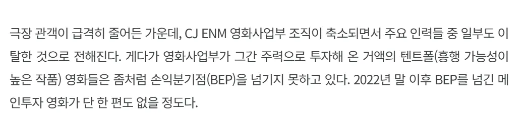 《NEWSTOF》消息称,CJ ENM 可能会缩减并重组其电影部门,预计在未来暂停对电影的新投资。一位工作人员接受采访时也表示,“目前没有电影处于前期制作阶段。”