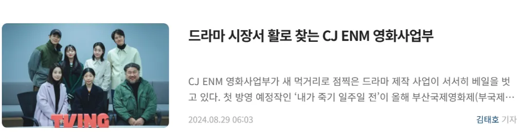 《NEWSTOF》报道,CJ ENM电影部门的新业务——电视剧制作业务正在慢慢展开,首部预定上映的《我去世的前一周》将在釜山国际电影节上映。值得注意的是,这是电影事业部单独开展的项目,不依赖于同一总部内的电视剧制作部门或子公司。