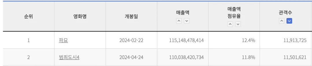 而今年,Showbox率先出手,出品的《破墓》上映7天过损益平衡点,上映32天累计人次突破千万,成为今年第一部获得千万观影人次的电影。Plus M的《犯罪都市4》再次冲破“续集魔咒”,上映5天破350万观影人次,接连创下今年韩国最高开画纪录、最高单日票房纪录。