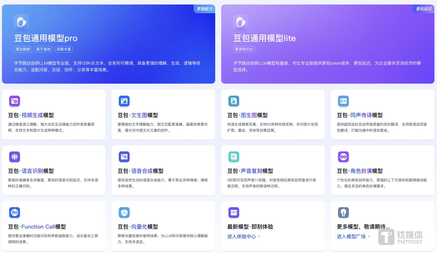 而且,豆包大模型时隔不到半年还实现6款模型发布和能力升级,包括:豆包·视频生成模型、豆包·同声传译模型、豆包·音乐模型;以及升级的豆包通用模型pro、豆包·语音合成模型、豆包·文生图模型。