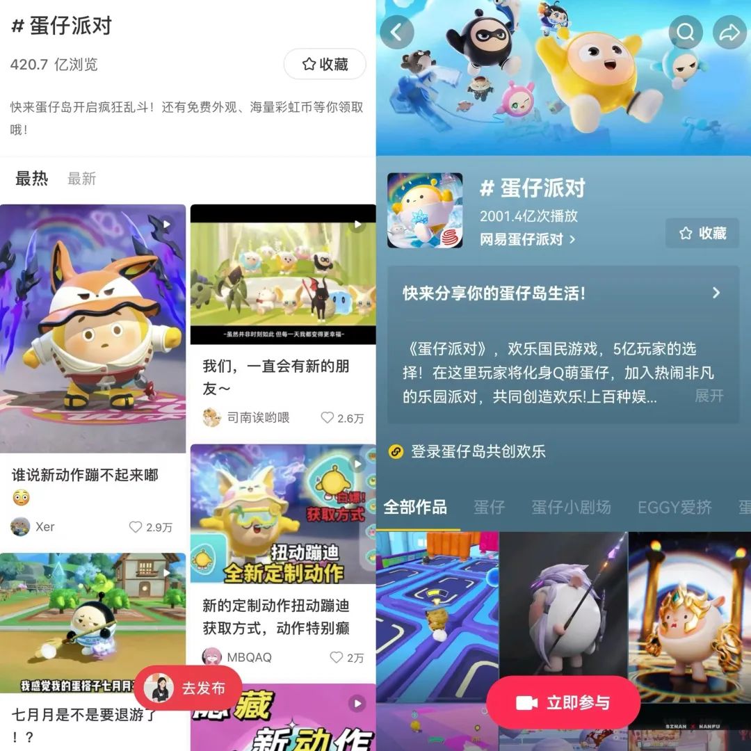 以头部游戏《蛋仔派对》为例,该话题在小红书的浏览量为420.5亿次,而在抖音播放量达到2000.6亿次,后者是前者的近五倍。