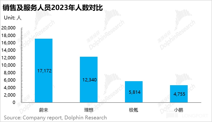 看着人头多出来很多,但实际上蔚来销售及服务人员中销售顾问人数其实并不多(据蔚来财报电话会议,蔚来真实的销售顾问人数在2023年底可能只有5000-6000人),真正的原因是这些人员中的三分之二(近1万人)几乎大部分都是蔚来服务的人员。(如Nio house服务/community/道路服务/换电站等各种服务人员)。