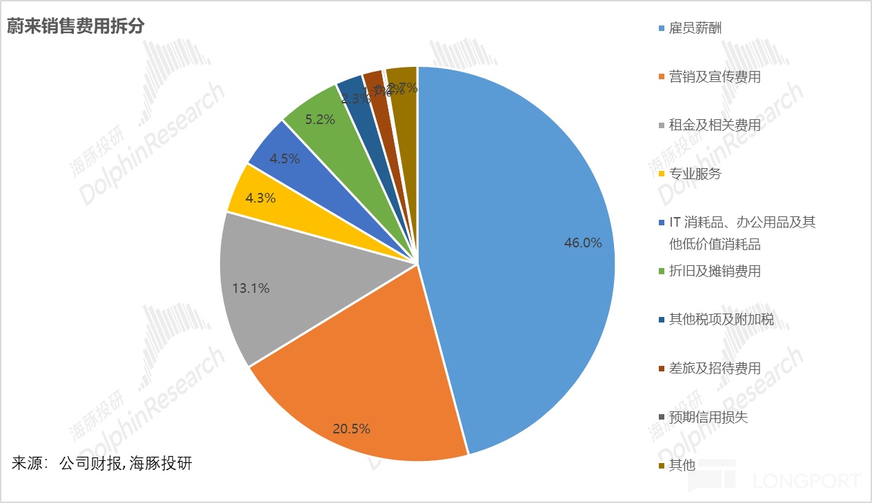 首先从蔚来的销售费用细分来看,占比最大的三个费用:雇员薪酬+营销宣传费用+租金费用占到了销售费用比重近80%。