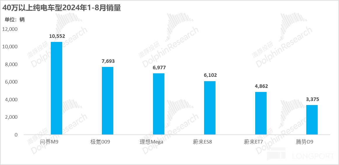 而从目前40万以上排名靠前的纯电车型来看,主要分为两类:① 纯电插混双线并行下,插混车型的爆火带来的溢出效应:如纯电款的问界M9与 腾势D9;② 车企推出的高端纯电MPV系列:如极氪009,理想Mega。