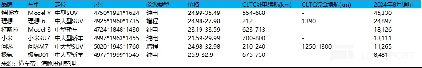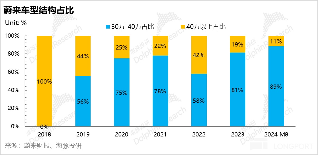 而目前蔚来的主力价格带已经基本逐步下沉到30万-40万元,其中车型位于30-40万元的占比逐年上升,在2024年1-8月达到了89%,所以海豚君重点关注蔚来销量基本盘的30-40万元市场。