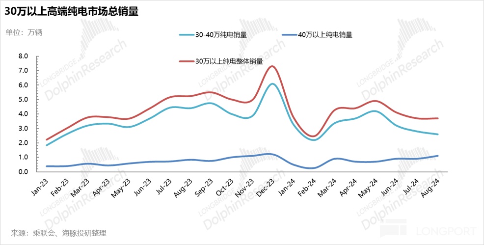 在品牌和车型结构向上困难的情况下,销量的继续提升空间可能仍需要依赖纯电高端市场的扩容。