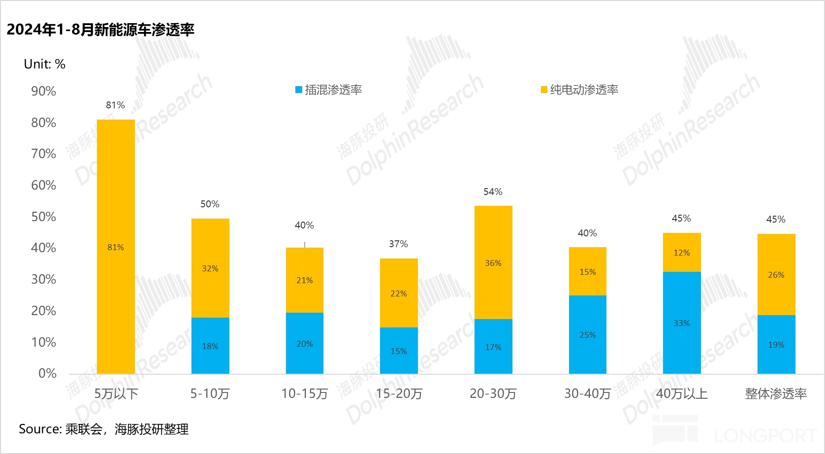 但这也导致了,高端纯电的渗透率仍然处于低位,其中2024年1-8月30-40万/40万元以上纯电渗透率仅平均不足15%,远低于整体纯电渗透率26%。