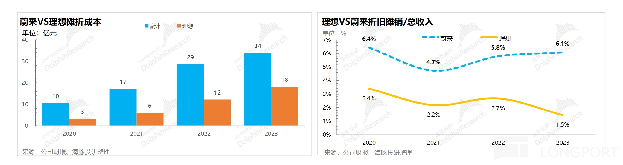 对比蔚来和理想的折旧摊销/总收入,蔚来在2023年折旧摊销/总收入比例达到了6.1%,高出理想4.6个百分点!