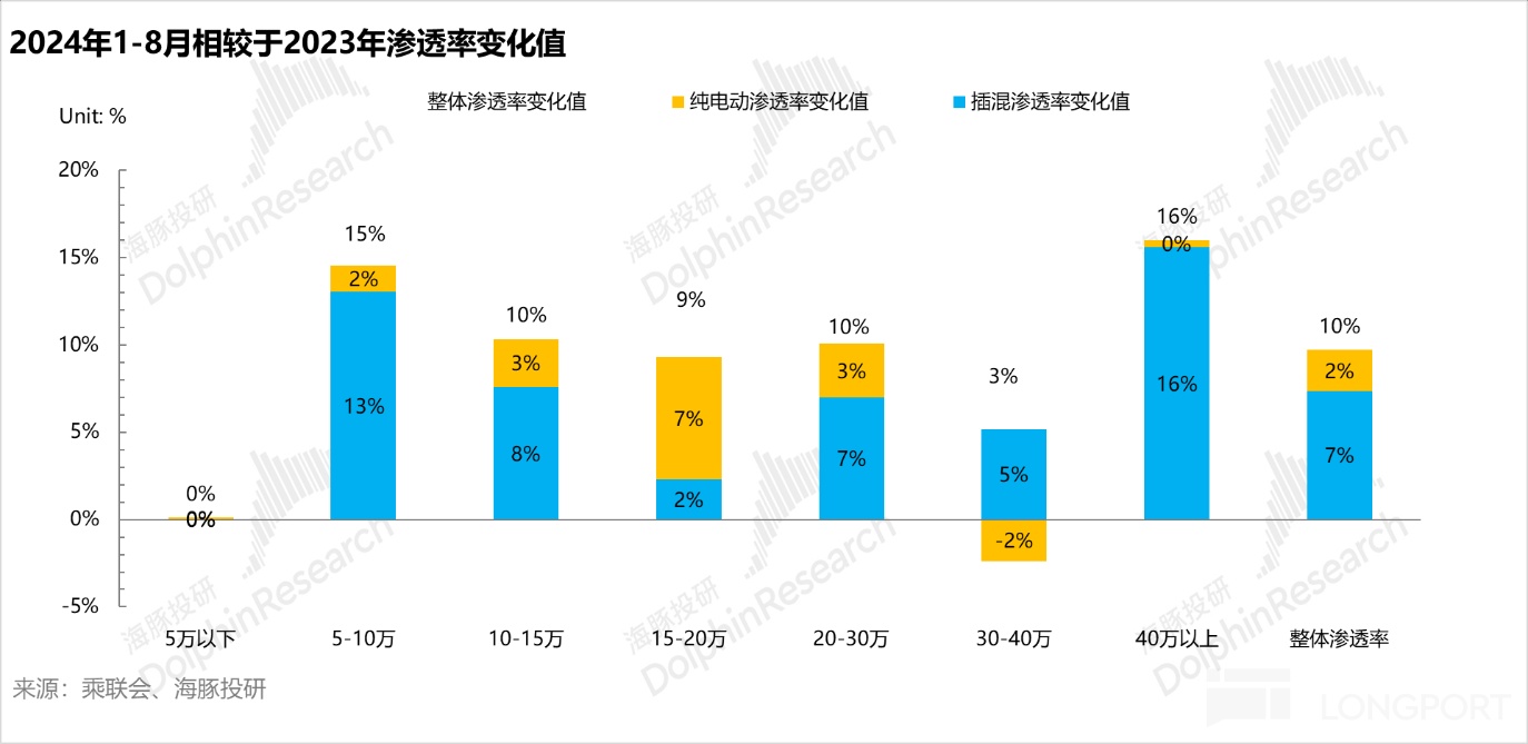 而纯电在40万元以上价格带渗透率几乎零提升,而在30-40万价格带渗透率甚至不升反降,2024年1-8月相比2023年下滑2个百分点,主要因为该价格带纯电车型难出爆款,高端纯电车企纷纷为了追求销量而选择了价格下沉战略。