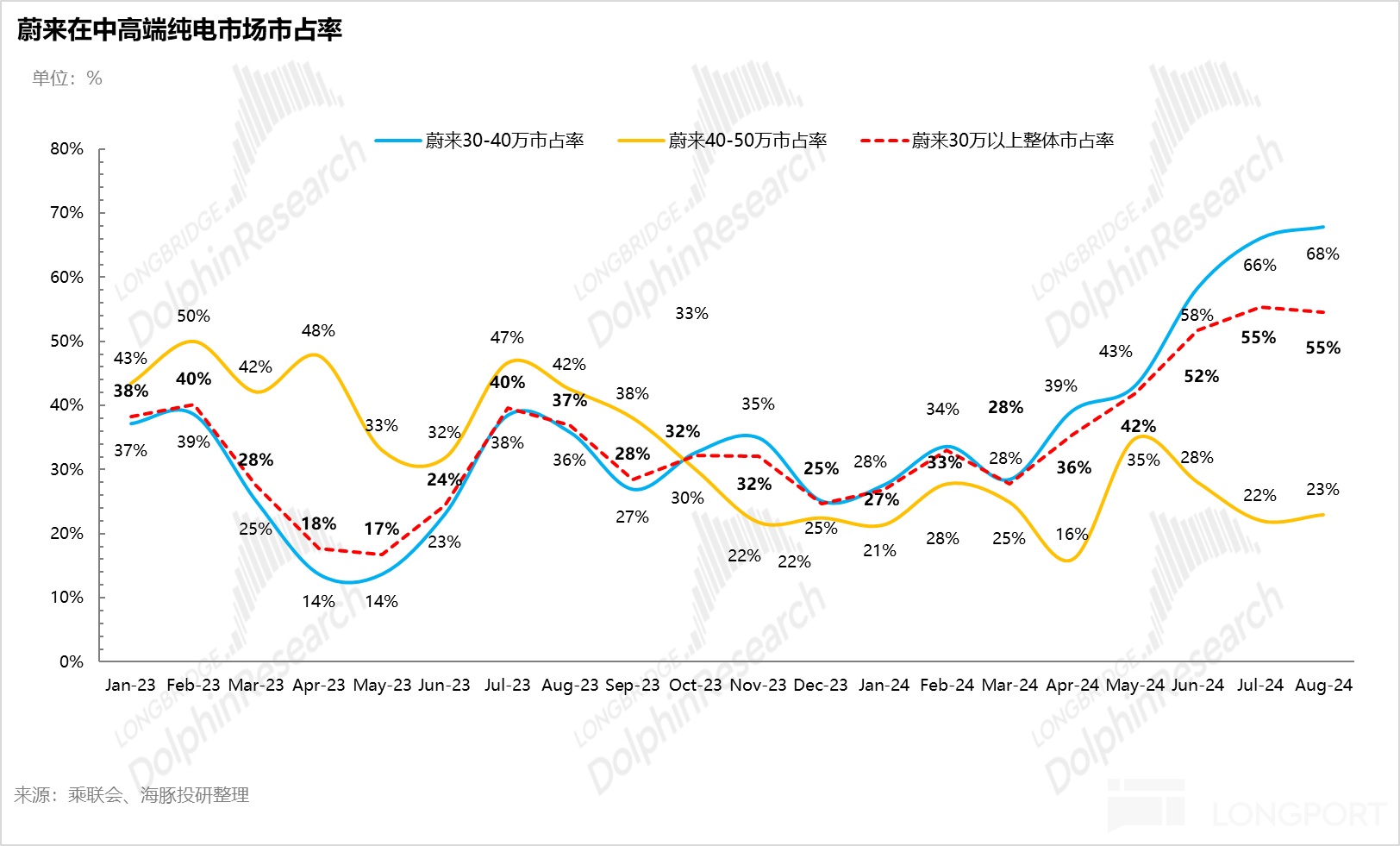 自2024年4月后迅速提升,到2024年8月蔚来在中高端纯电市场的市占率已经提升到55%,几乎占据了中高端纯电的半壁江山。