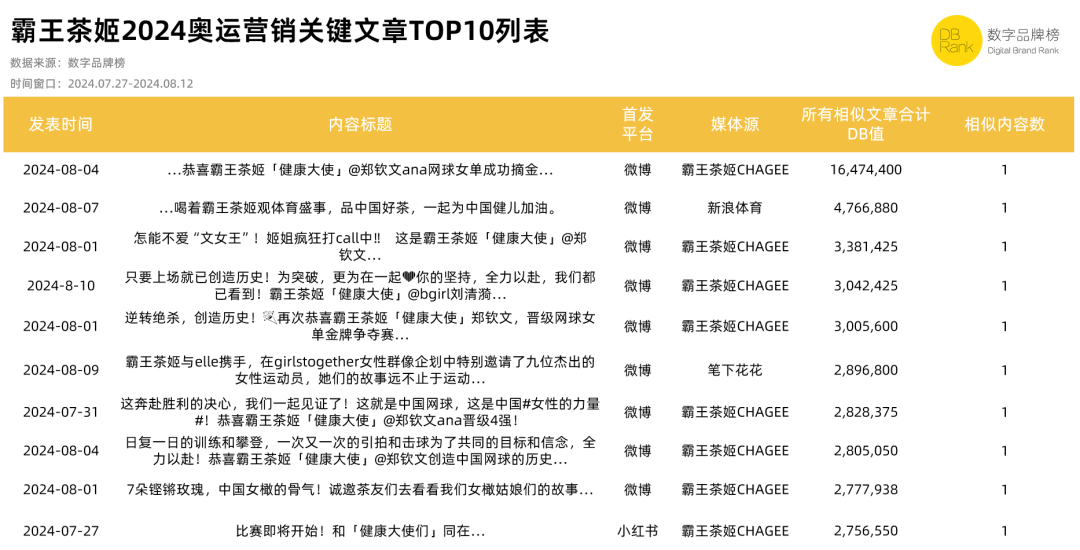 用网友的话说就是“霸王茶姬赢麻了”,甚至有网友调侃,“但凡晚几天签约,代言费恐怕要翻上几番”。从『数字品牌榜』的观测数据中,可以看到,霸王茶姬奥运营销的TOP10内容中,官方账号于微博平台发布的郑钦文夺冠相关内容为品牌贡献了最多的数字品牌价值。