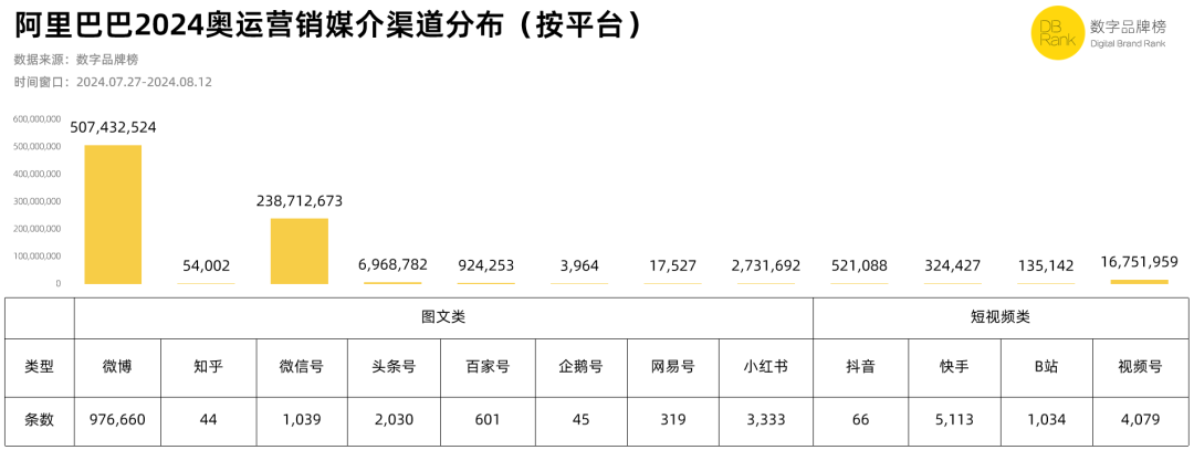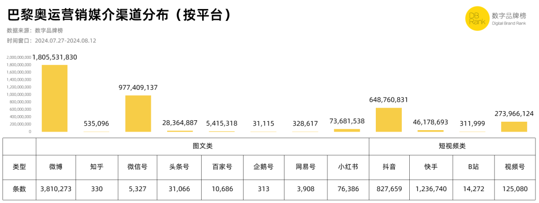 以微博平台为例,巴黎奥运期间,微博全平台发博数达4.16亿条,互动量达16.98亿,话题阅读量达4,790亿。再看品牌营销方面的数据,『数字品牌榜』以2024年7月27日-8月12日为时间窗口,对上百个品牌的奥运营销观测数据显示,微博以3,810,273条内容贡献了1,805,531,830 DB的数字品牌价值,奥运营销的传播效果最好,其次是以长图文为主的微信号。