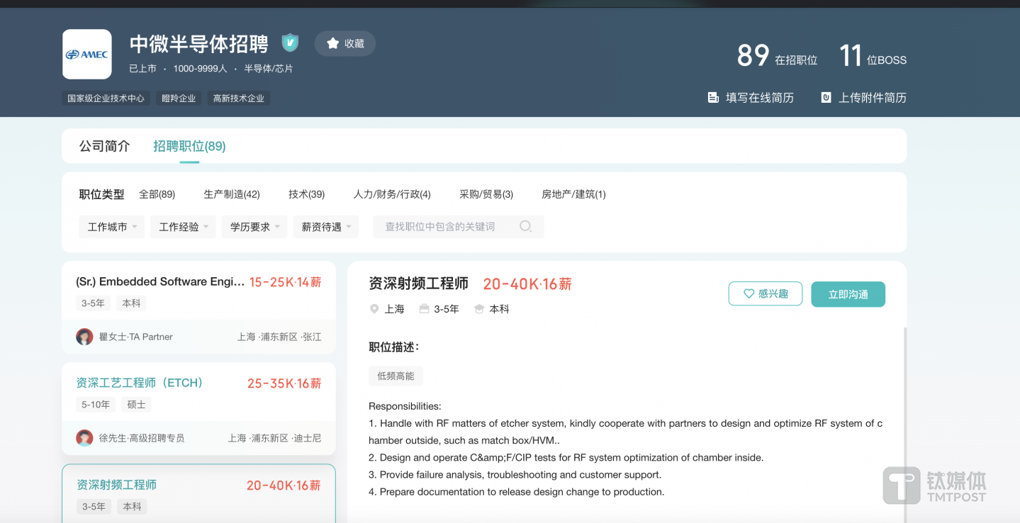 在半导体设备领域,人才成本越来越高。以中微为例,一个资深射频工程师和工艺工程师的月薪最高达40000元,年薪就要超过60万元。而同时,受制于美国出口管制和商务部相关规定,中微难以从ASML、应用材料、科磊(KLA)这些外企找资深的外籍员工,因此,半导体设备领域的资深人才稀缺还贵,加上整个大环境不佳,留住现有人才是更为紧迫的事情。