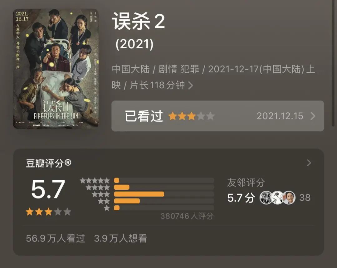 肖央主演的《误杀》系列,豆瓣第二部评分仅5.7,其背后的主控公司恒业影业也已经暴雷。《误杀2》IP的主控方更需要的是肖央本人给电影加持,而不是把更多的收益给到导演和制片,足见该IP的制作能力之弱。