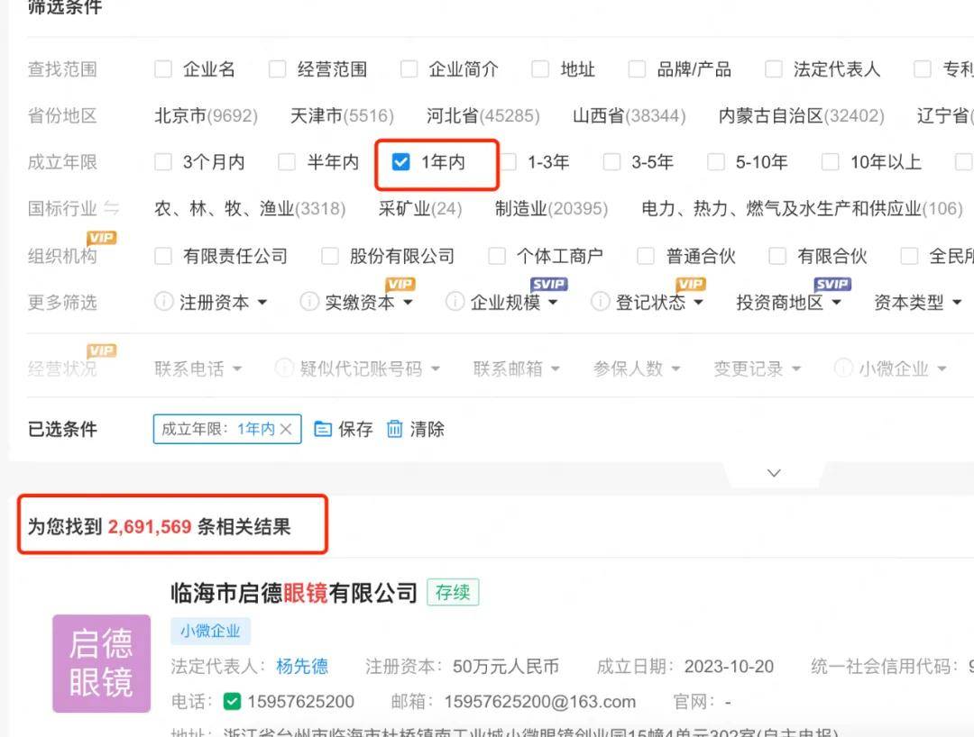 在我国,除了隐形眼镜等品类外,框架眼镜等其他眼镜产品不属于医疗器械,行业准入门槛低。在企查查中对“眼镜”关键字检索显示,成立年限在1年内的企业就有269.16万家。