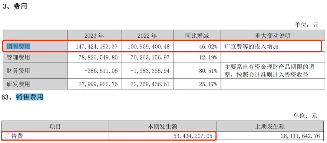 因此,明月镜片的销售费用也支出不少。2023年财报显示,公司销售费用为1.47亿元,较2022年增长了46.02%。其中,广告费就高达5343.42万元,同比增长46.02%。2023年,明月镜片销售费用占当期营业收入的比例为19.69%。