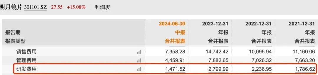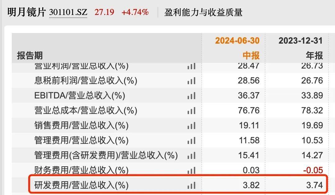 2024年上半年,同行公司康耐特光学的研发成本为4839.9万元,占当期收入的比例为4.96%,明显高于明月镜片。