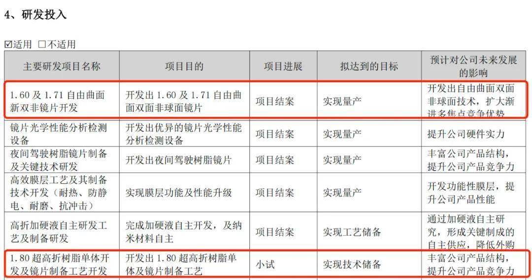 值得注意的是,2023年财报显示,明月镜片1.60及1.71自由曲面双面非球面镜片刚刚实现量产,且1.80超高折树脂单体开发及镜片制备工艺开发还在小试当中。