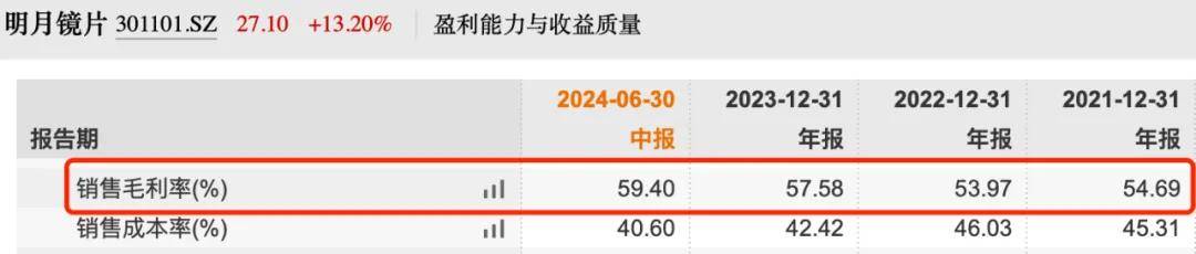 因为较低的消费频次,镜片行业不得不用“高毛利”来维持盈利水平。公开数据显示,2021年-2024年上半年,明月镜片销售毛利率分别为54.69%、53.97%、57.58%和59.40%。整体上看,公司毛利率一直维持在较高的水平。