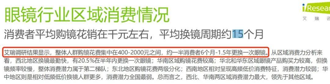 明月镜片主营业务为光学镜片。和其他消费品不同的是,眼镜零售是一个低频次消费。艾瑞调研结果显示,消费者购镜花费集中在400-2000元之间,平均换镜周期约15个月。