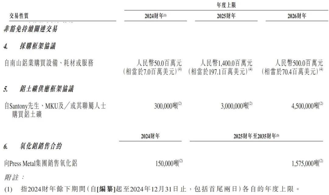 招股书显示,2024财年至2026财年,南山铝业国际会向Santony、MKU及/或其联属人士购买铝土矿不超过30万吨、300万吨、450万吨。(编者按:此处的2024财年不是全年,而是指2024财年余下时间,下同。)