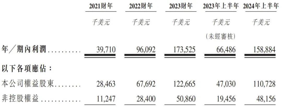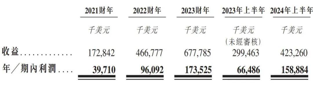 借助于此,南山铝业国际的业绩水涨船高。招股书显示,2021财年至2024年上半年(以下简称:报告期),其收益分别为1.73亿美元、4.67亿美元、6.78亿美元、4.23亿美元;年内利润3971.0万美元、9609.2万美元、1.74亿美元、1.59亿美元。