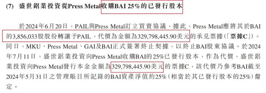 次日(即6月20日),公司又与Press Metal方面订立协议,规定公司应向Press Metal特殊目的公司配发2558.85万股公司股份,代价为3.30亿美元,代价相当于Press Metal向南山铝业国际子公司转让BAI 25%股权价格。