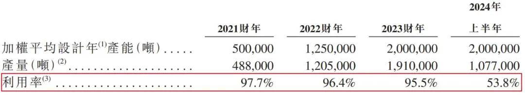 但一个不得不提的现实情况是,南山铝业国际的利用率出现了“断崖式”下滑。2021财年-2024年上半年,现有生产设施的利用率分别为97.7%、96.4%、95.5%及53.8%。