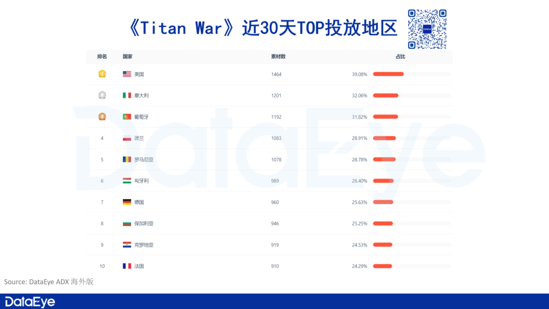 根据ADX海外版数据显示,在投放市场方面,《Titan War》近30天主投美国市场,投放素材数达到1400+,占比所有投放市场的39.08%。其余排在TOP10投放地区的均是欧洲市场。